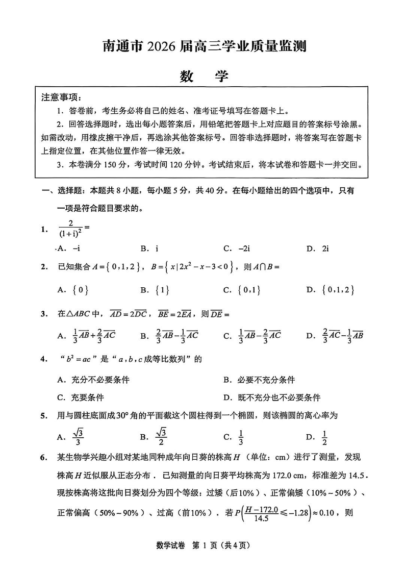 江苏省南通市2026届高三上学期学业质量监测 数学试题(含答案).pdf
