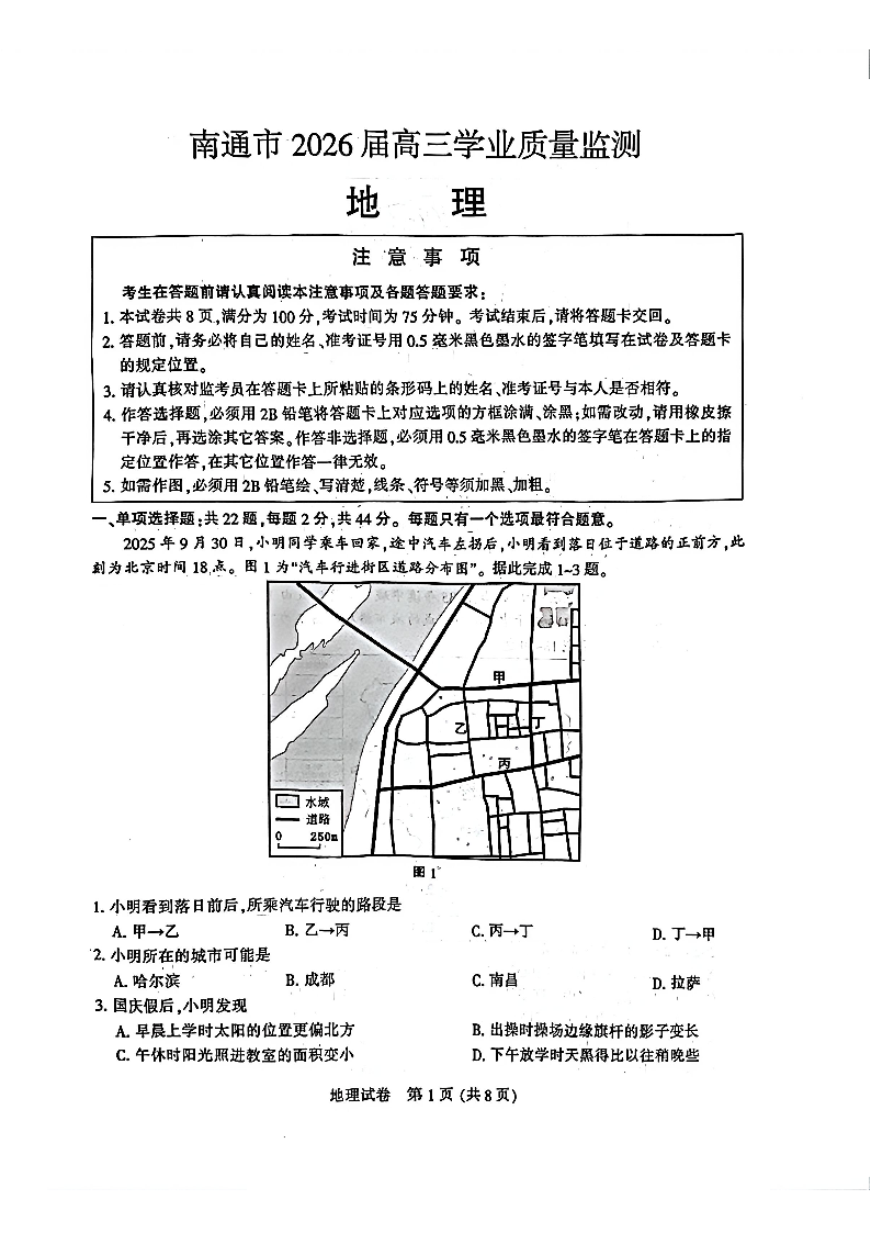 江苏省南通市2026届高三上学期学业质量监测 地理试题(含答案).pdf