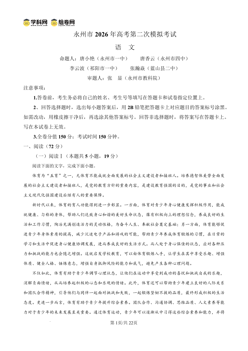 永州市2026年高考第二次模拟考试 语文答案.pdf