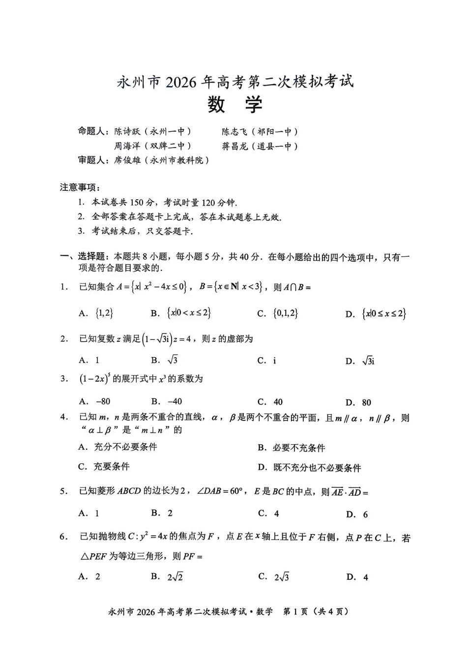 永州市2026年高考第二次模拟考试 数学.pdf