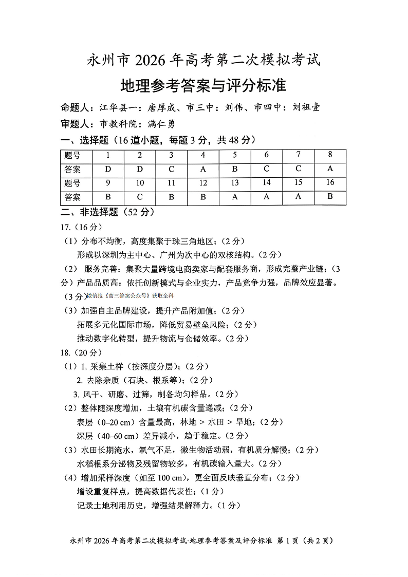 永州市2026年高考第二次模拟考试 地理答案.pdf