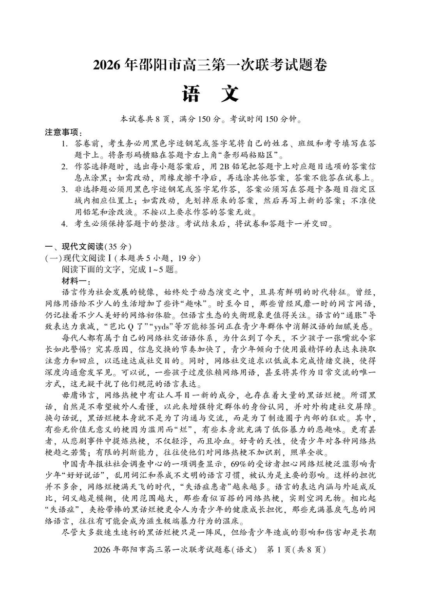 2026年邵阳市高三第一次联考试题卷 语文试题(含答案).pdf