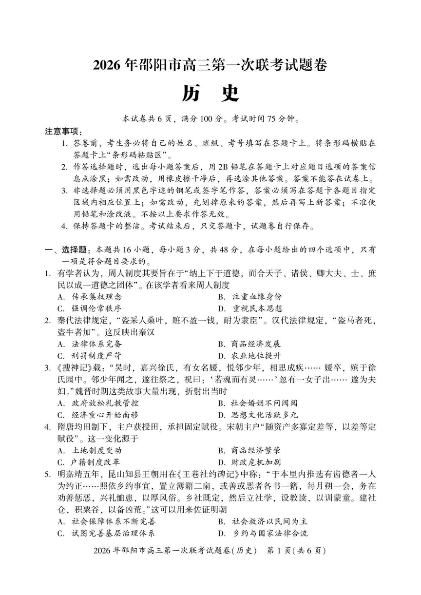 2026年邵阳市高三第一次联考试题卷 历史试题(含答案).pdf