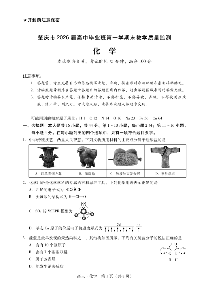 肇庆市2026届高中毕业班高三年级第一学期末教学质量监测 化学.pdf