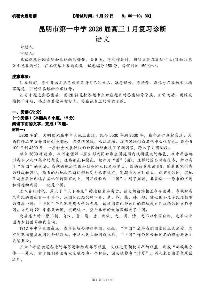 昆明市第一中学2026届高三年级1月复习诊断 语文试题(含答案).pdf