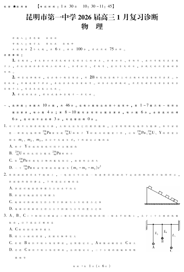 昆明市第一中学2026届高三年级1月复习诊断 物理试题(含答案).pdf
