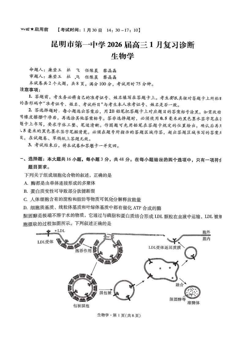 昆明市第一中学2026届高三年级1月复习诊断 生物试题(含答案).pdf