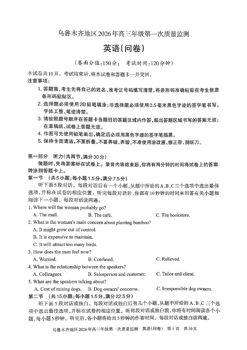 乌鲁木齐地区2026年高三年级第一次质量监测 英语.pdf