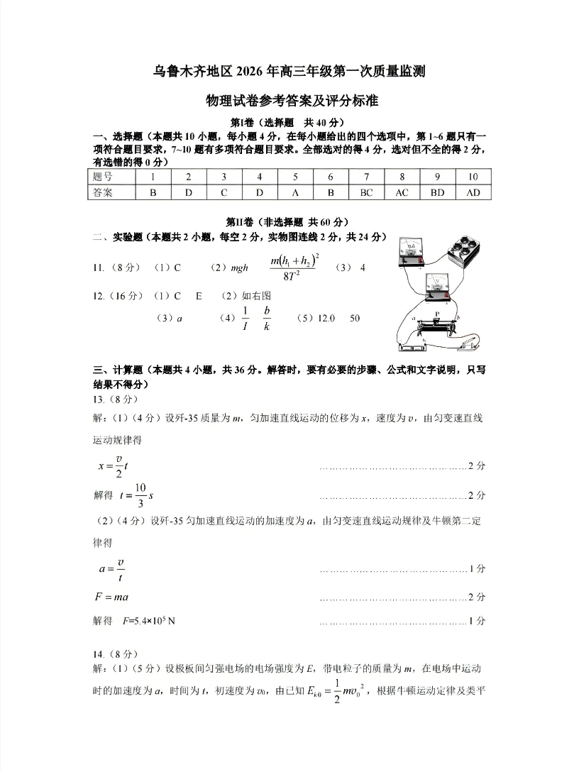 乌鲁木齐地区2026年高三年级第一次质量监测 物理答案.pdf