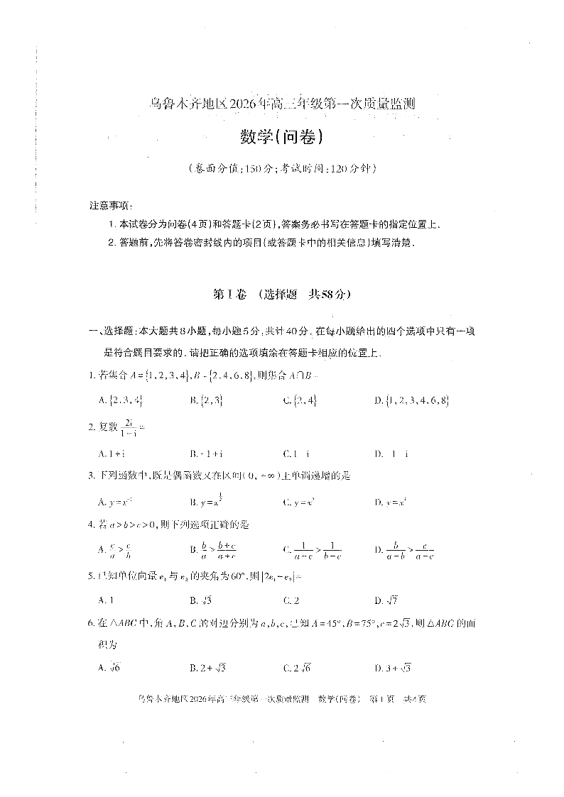 乌鲁木齐地区2026年高三年级第一次质量监测 数学.pdf