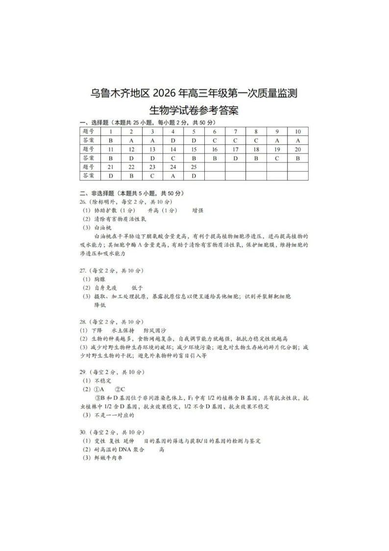 乌鲁木齐地区2026年高三年级第一次质量监测 生物答案.pdf