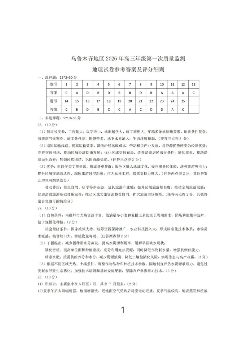 乌鲁木齐地区2026年高三年级第一次质量监测 地理答案.pdf