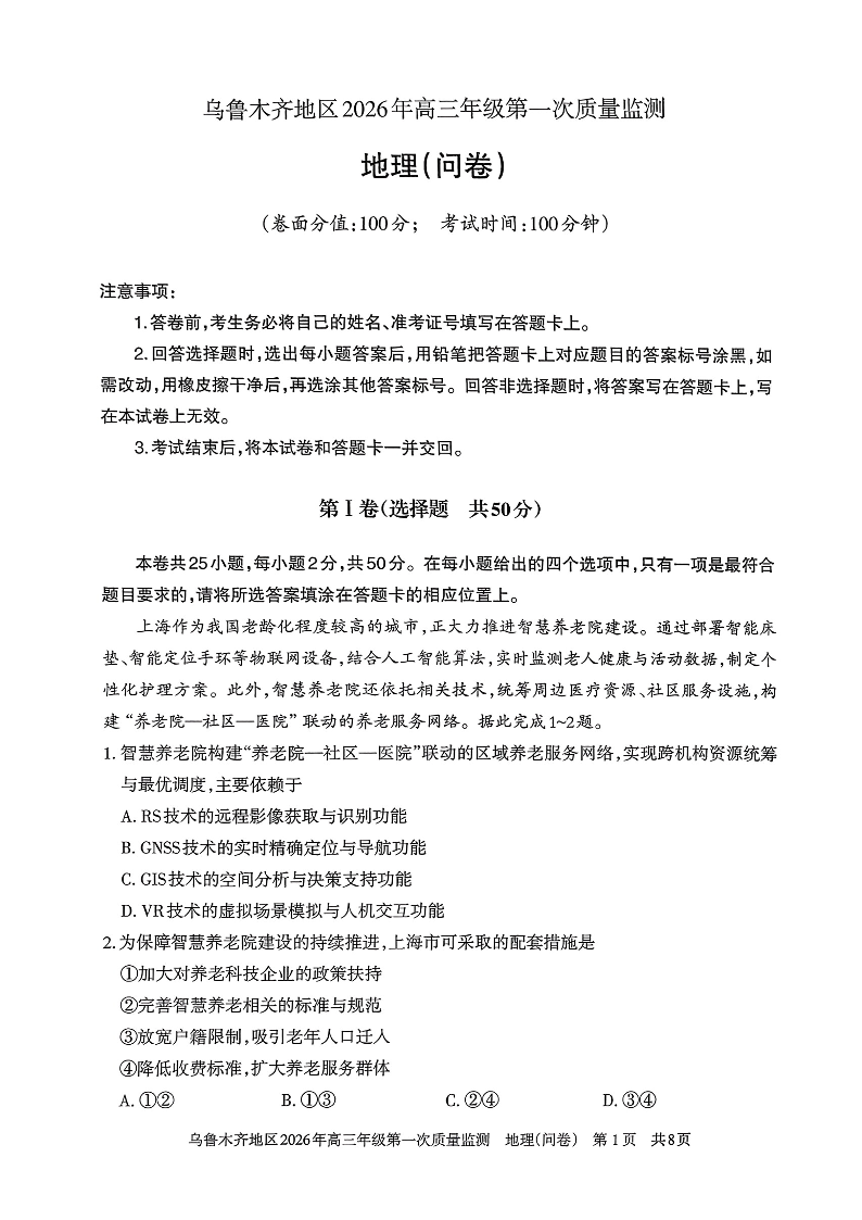 乌鲁木齐地区2026年高三年级第一次质量监测 地理.pdf