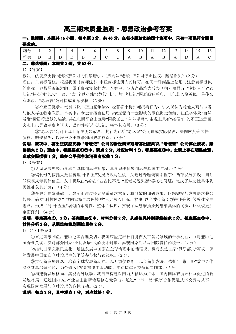 辽宁省点石联考2026届高三期末质量监测 政治答案.pdf