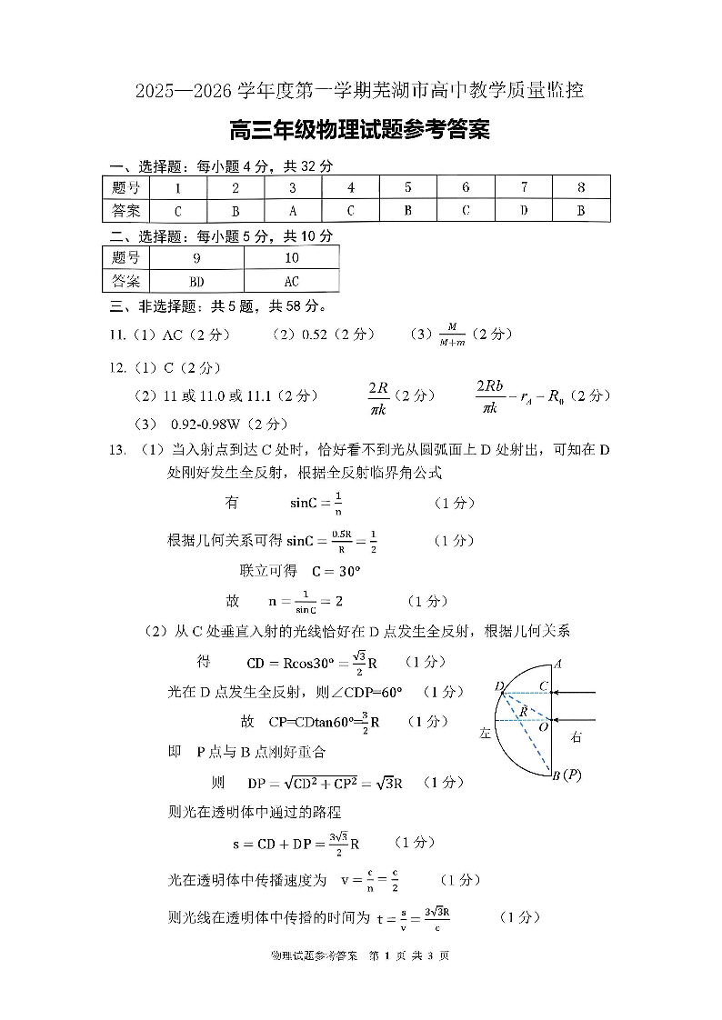 2025-2026学年度第一学期芜湖市高中教学质量监控 物理答案.pdf