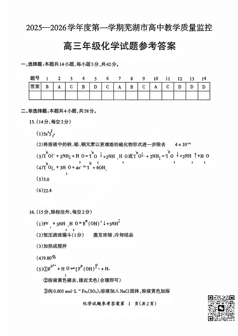 2025-2026学年度第一学期芜湖市高中教学质量监控 化学答案.pdf