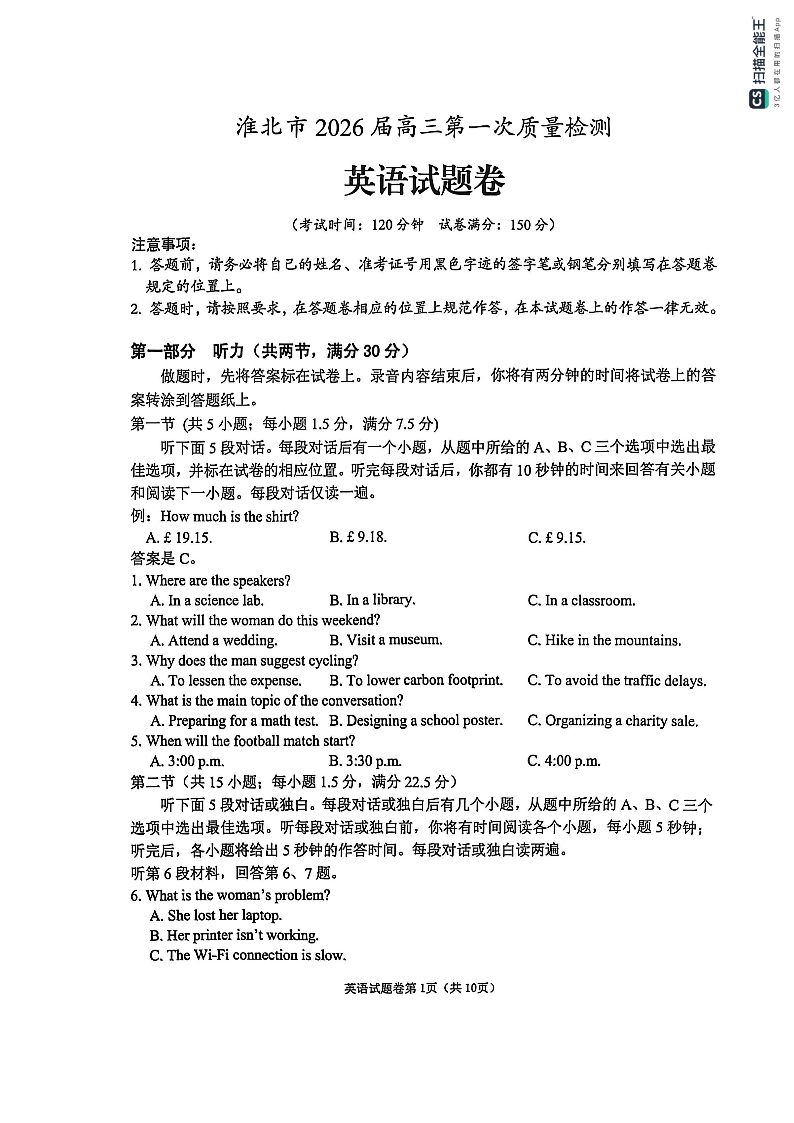 安徽省淮北市2026届高三年级第一次质量检测 英语.pdf