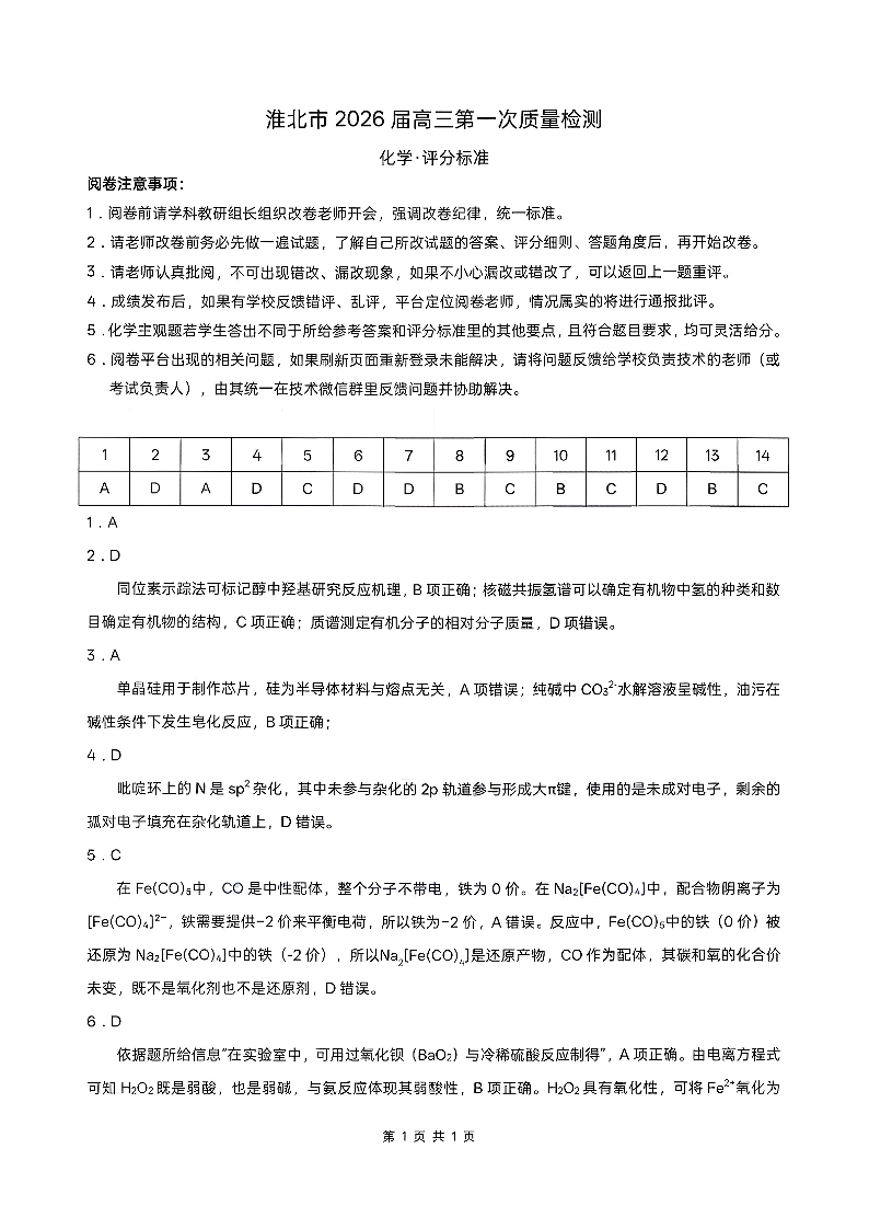 安徽省淮北市2026届高三年级第一次质量检测 化学答案.pdf