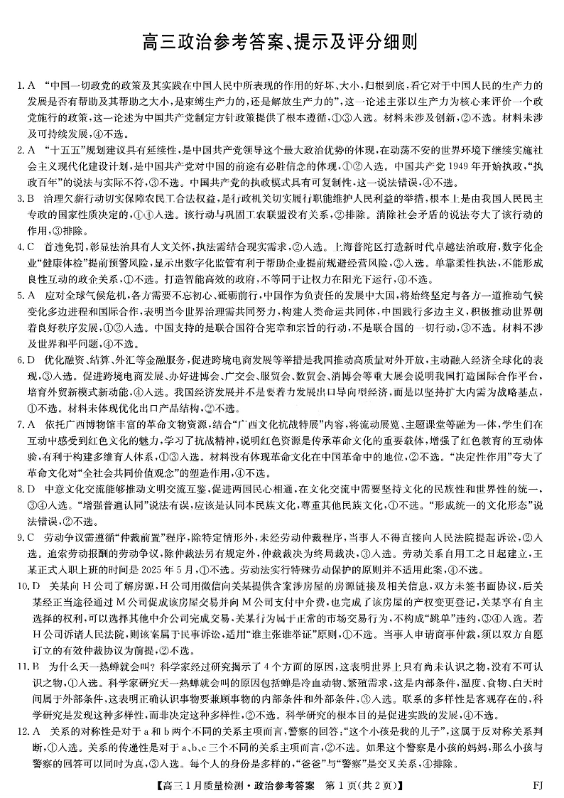 福建省莆田市2026届高中毕业班第一次质量检测 政治答案.pdf