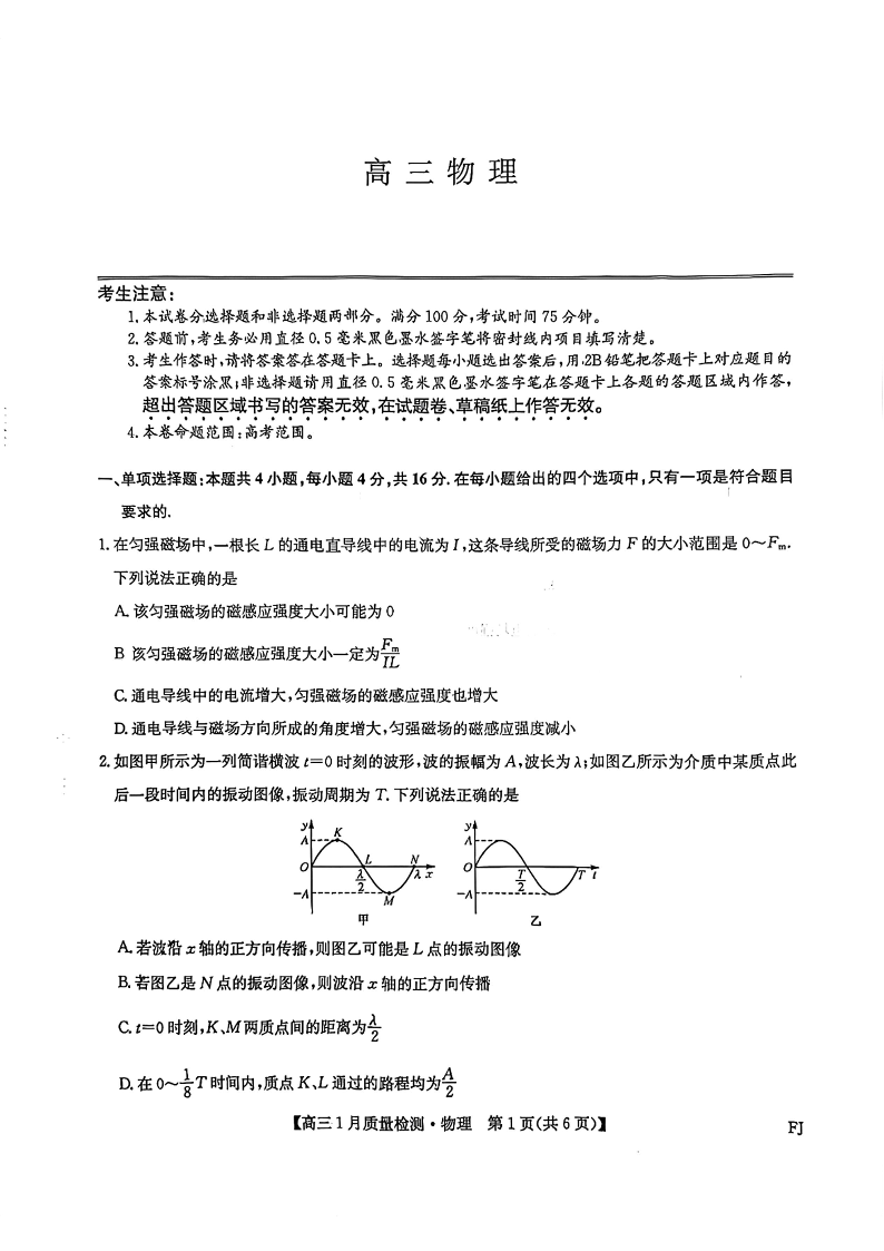 福建省莆田市2026届高中毕业班第一次质量检测 物理.pdf