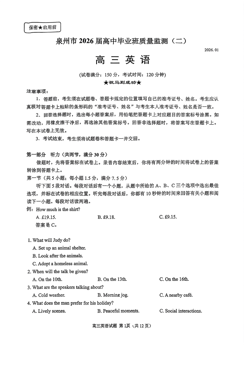 福建省泉州市2026届高中毕业班质量监测(二)英语.pdf