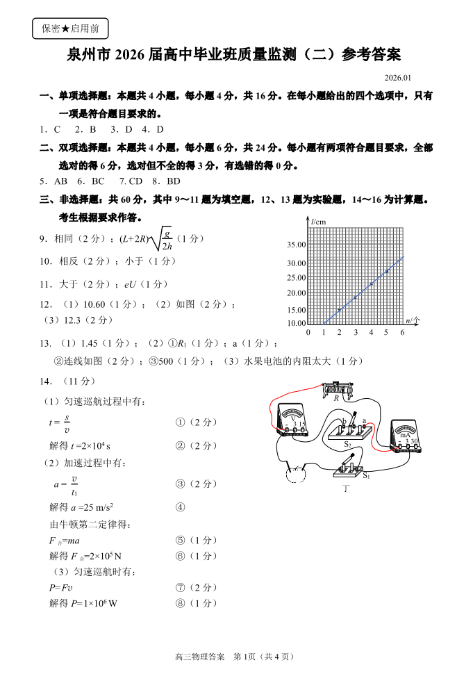 福建省泉州市2026届高中毕业班质量监测(二)物理答案.pdf