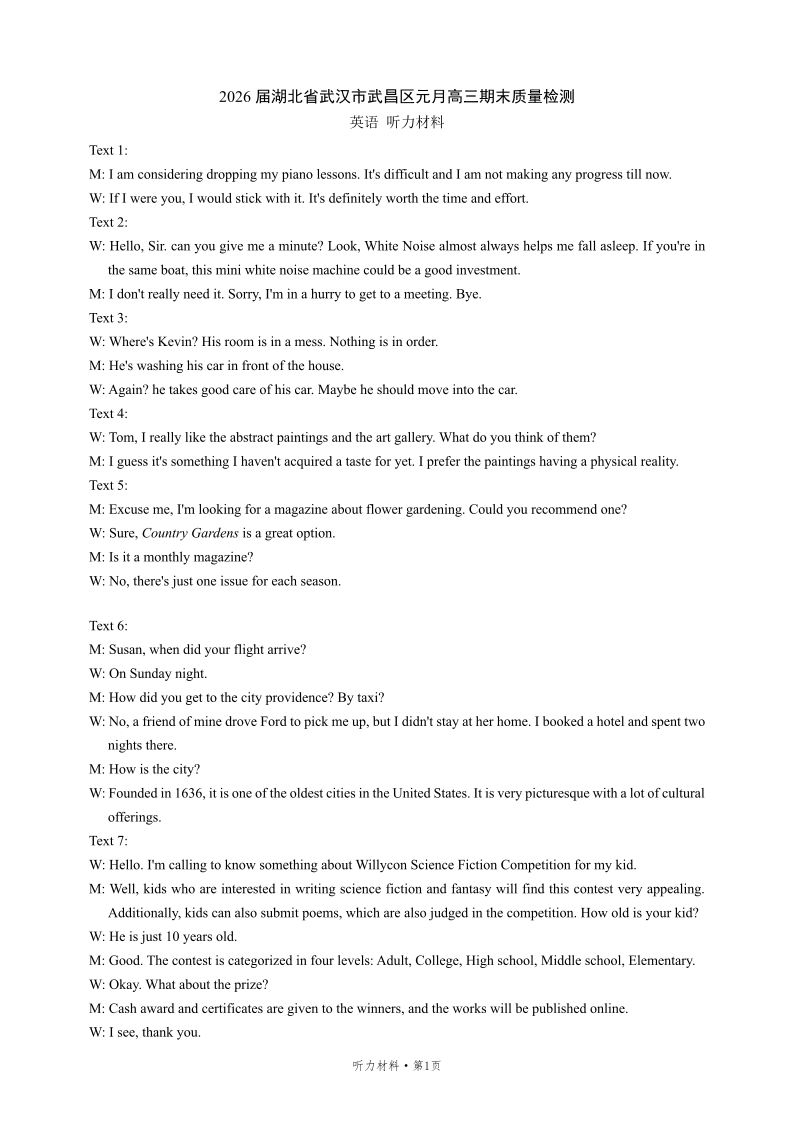 武昌区2026届高三年级上学期期末质量检测 英语听力材料.pdf
