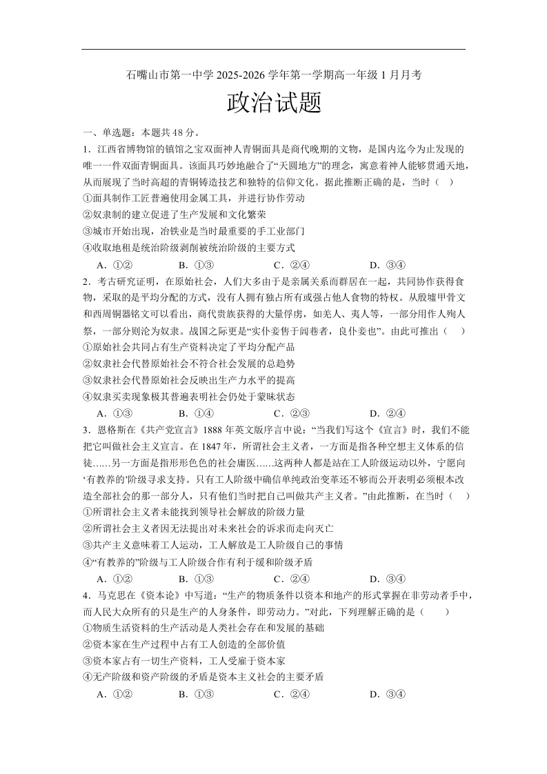 石嘴山市第一中学2025-2026学年高一上学期1月月考 政治.docx