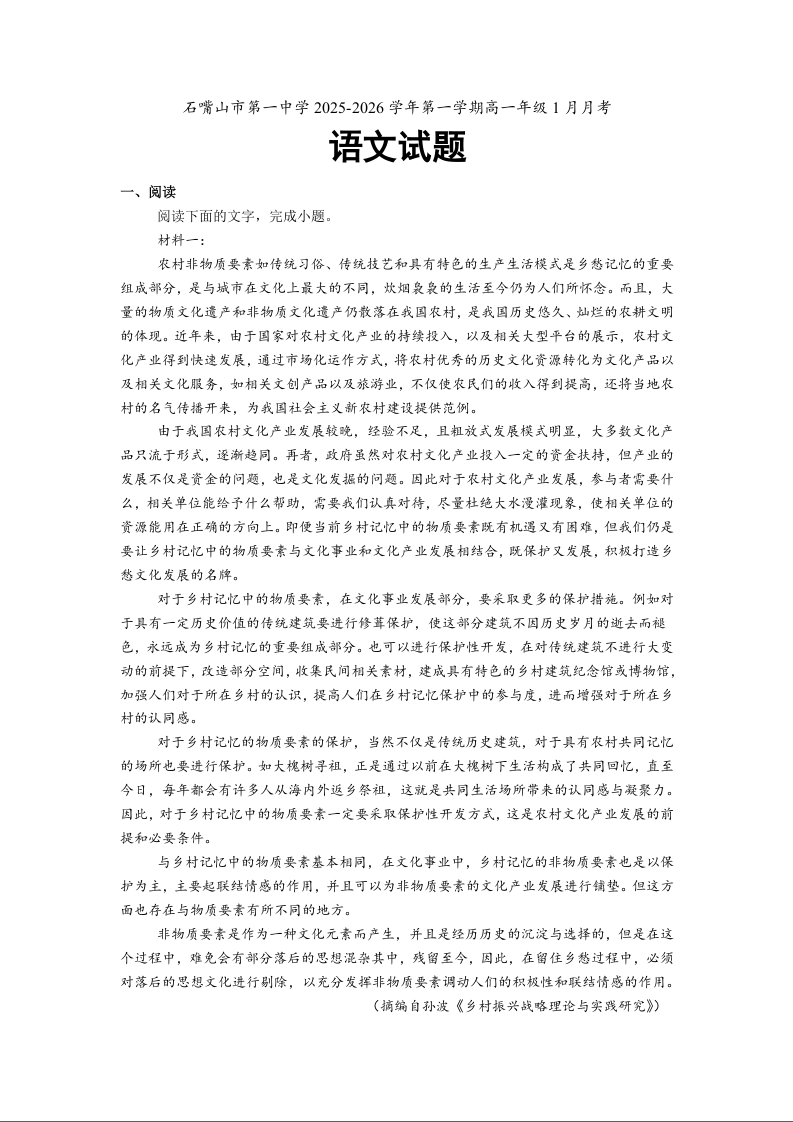 石嘴山市第一中学2025-2026学年高一上学期1月月考 语文.docx