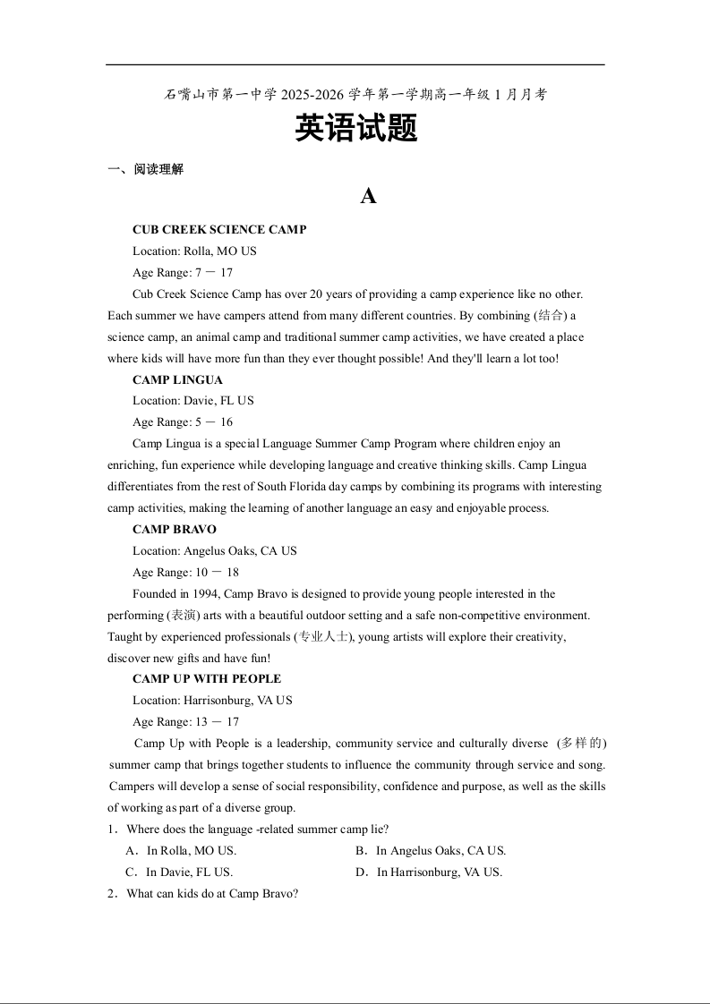 石嘴山市第一中学2025-2026学年高一上学期1月月考 英语.docx