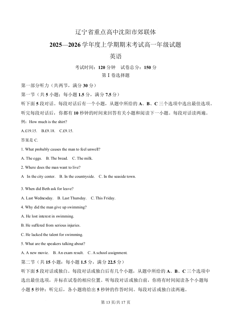 辽宁省重点高中沈阳市郊联体2025-2026学年高一上学期期末 英语答案.docx