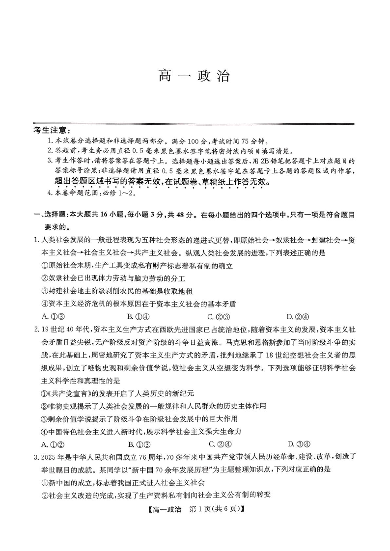 河北省保定市六校2025-2026学年高一上学期1月期末考试 政治.pdf