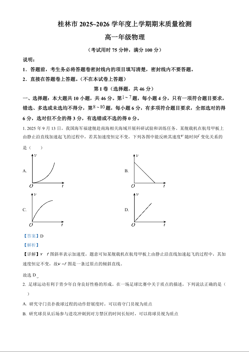 桂林市2025-2026学年度高一年级上学期期末质量检测 物理答案.docx