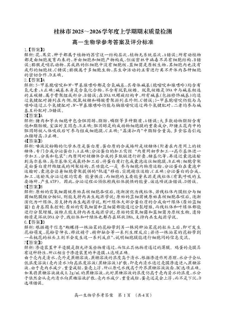 桂林市2025-2026学年度高一年级上学期期末质量检测 生物答案.pdf