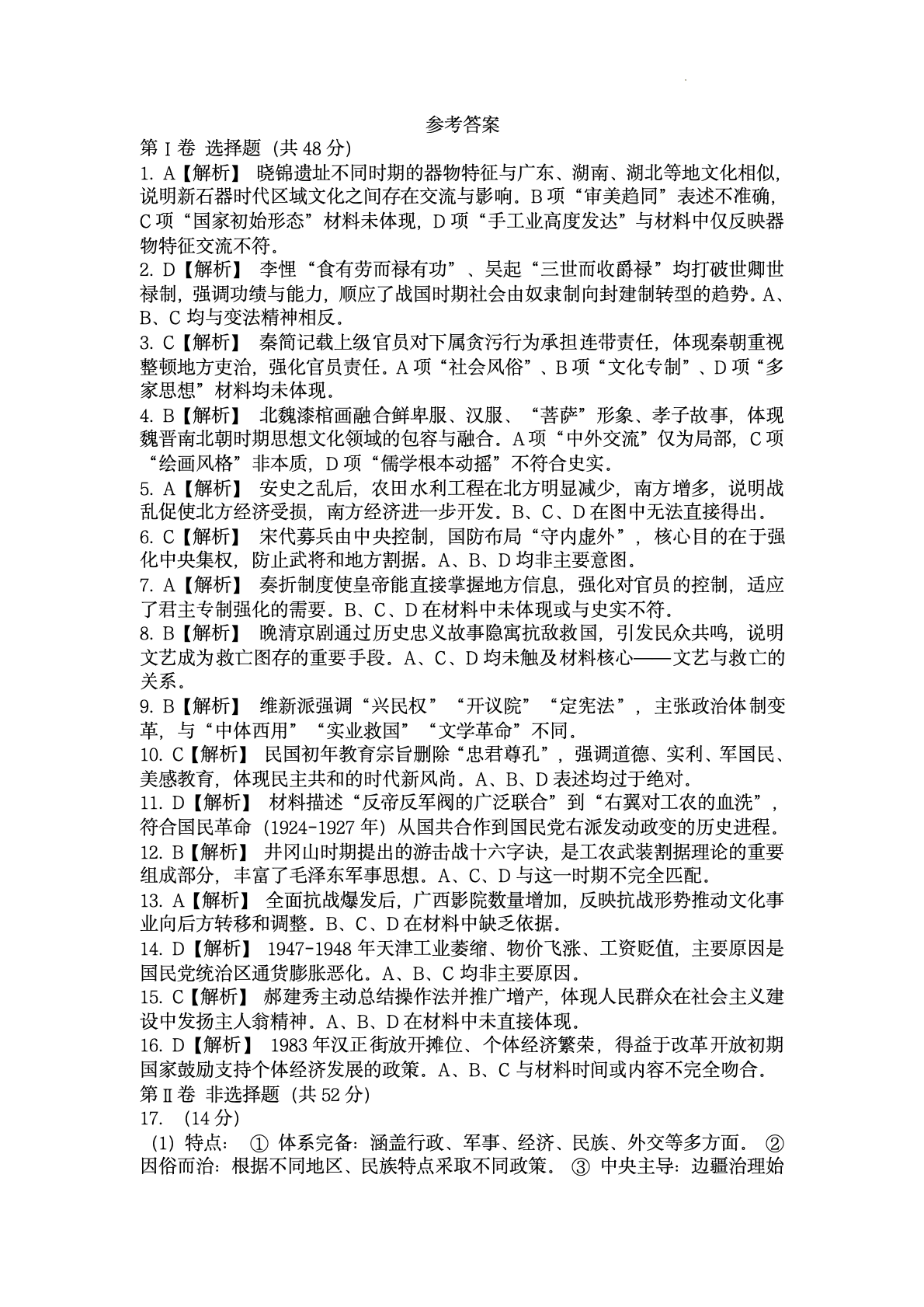 桂林市2025-2026学年度高一年级上学期期末质量检测 历史答案.pdf