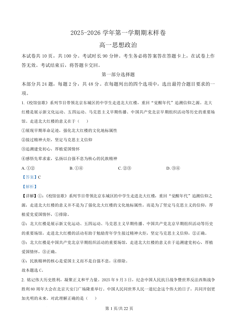 北京市东城区2025-2026学年高一上学期期末样卷 政治答案.docx