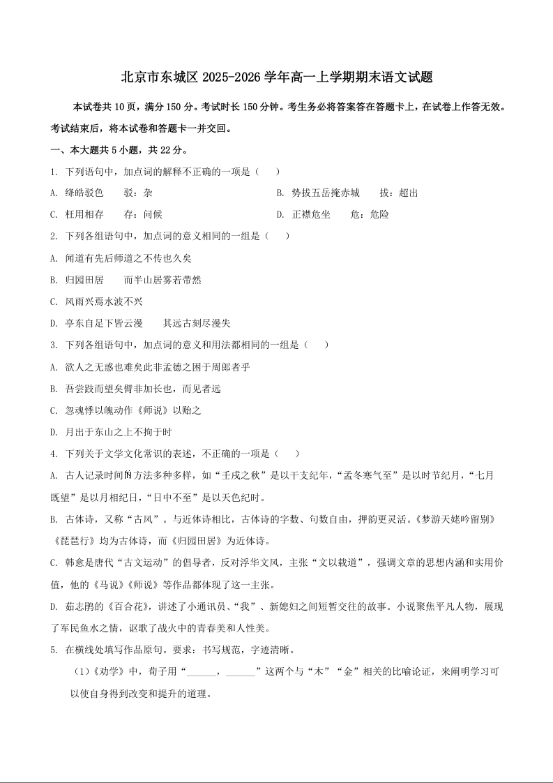 北京市东城区2025-2026学年高一上学期期末样卷 语文试题(含答案).docx