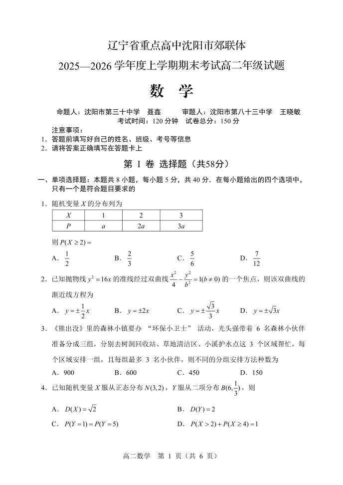 辽宁省重点高中沈阳市郊联体2025-2026学年高二上学期期末 数学.pdf