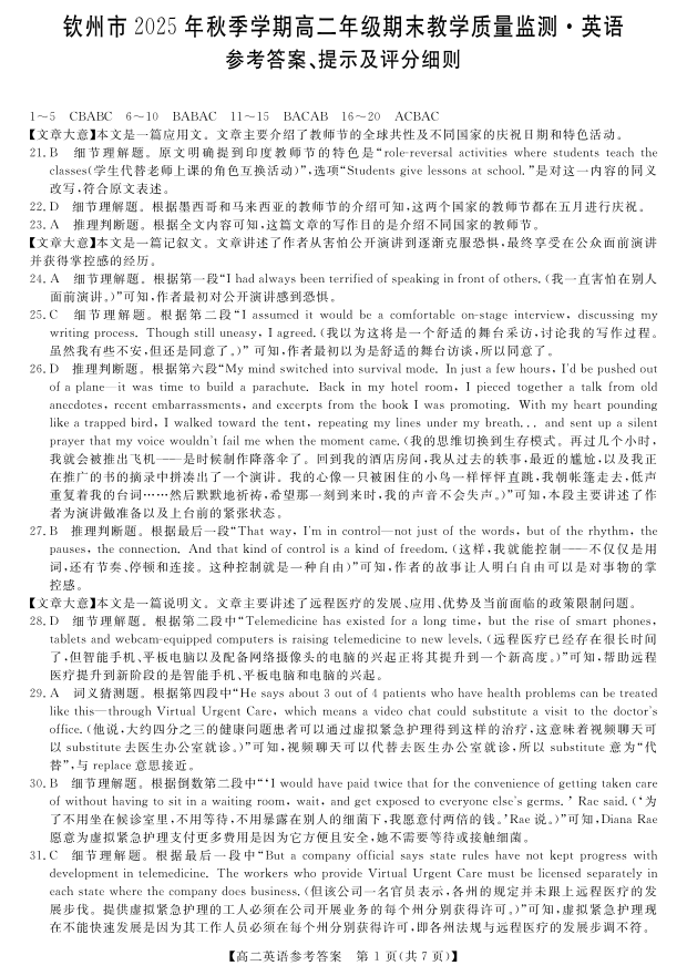 钦州市2025年秋季学期高二年级期末教学质量监测 英语答案.pdf