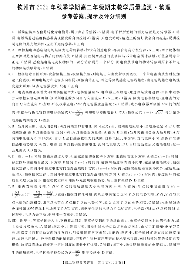 钦州市2025年秋季学期高二年级期末教学质量监测 物理答案.pdf