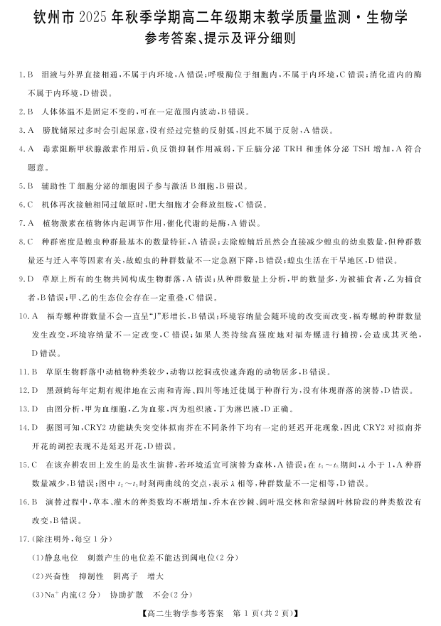 钦州市2025年秋季学期高二年级期末教学质量监测 生物答案.pdf
