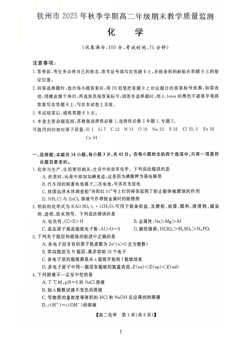 钦州市2025年秋季学期高二年级期末教学质量监测 化学.pdf