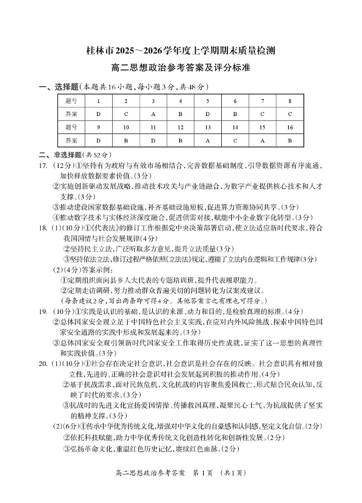 桂林市2025-2026学年高二年级上学期期末质量检测 政治答案.pdf