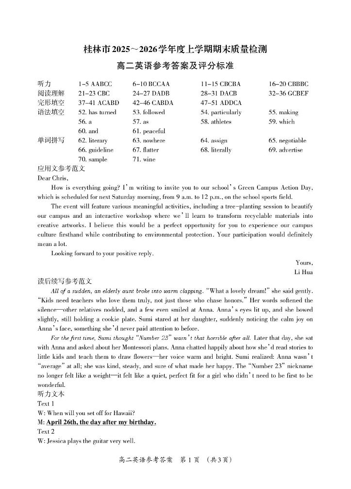 桂林市2025-2026学年高二年级上学期期末质量检测 英语答案.pdf