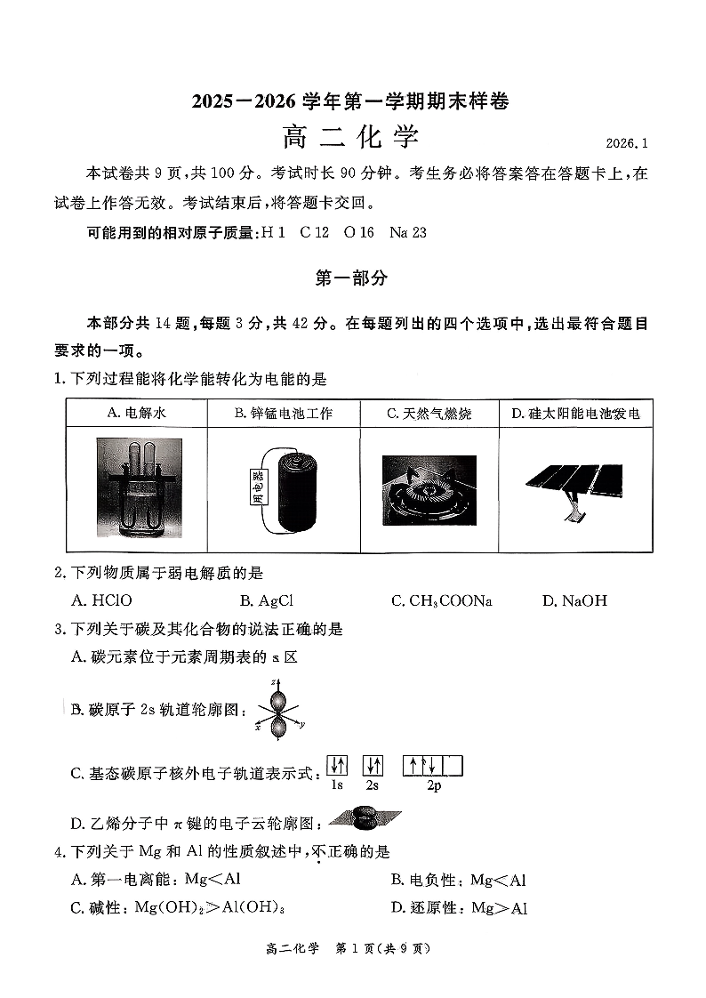 北京市东城区2025-2026学年高二上学期期末样卷 化学试题(含答案).pdf