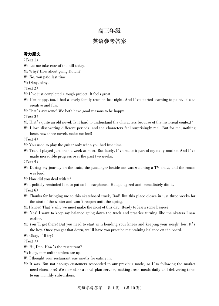 百色市2026年1月高三毕业班教学质量检测 英语答案.pdf