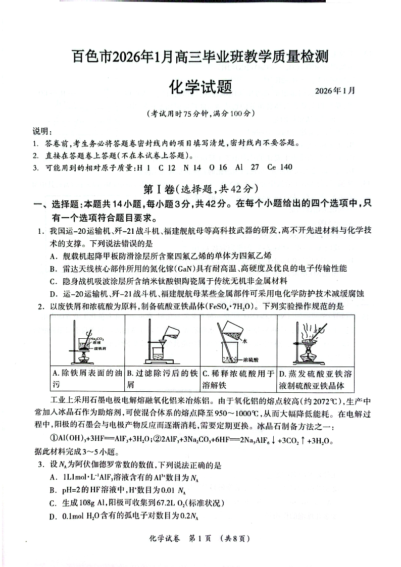 百色市2026年1月高三毕业班教学质量检测 化学.pdf