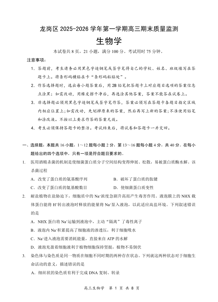 深圳市龙岗区2025-2026学年第一学期高三期末质量监测 生物.pdf
