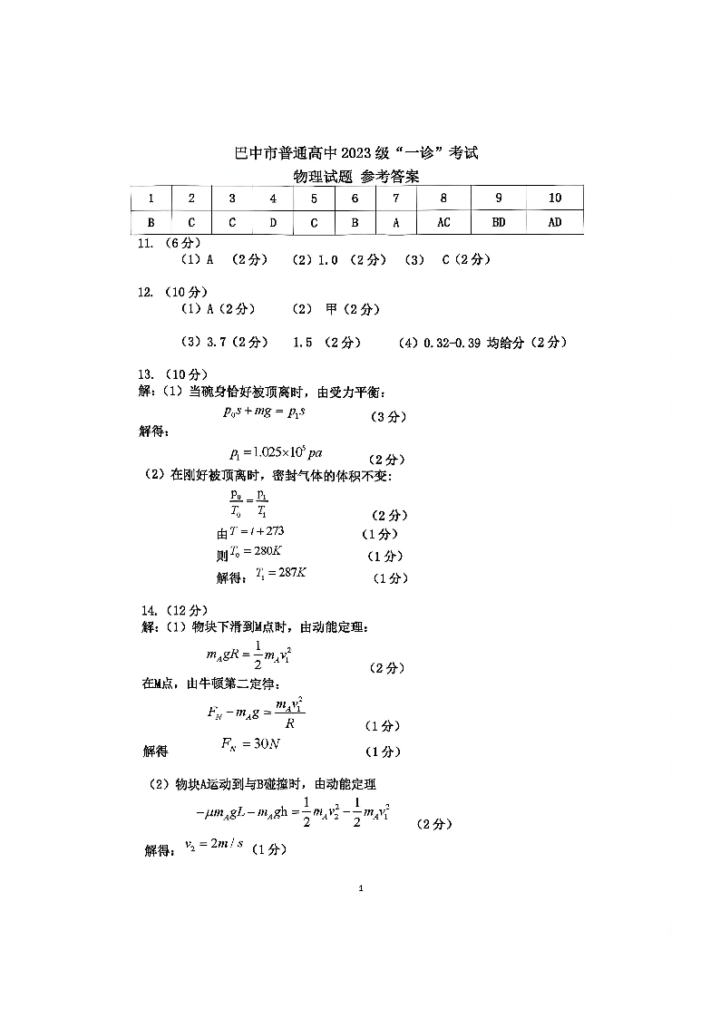 巴中市普通高中2023级“一诊”考试 物理答案.pdf