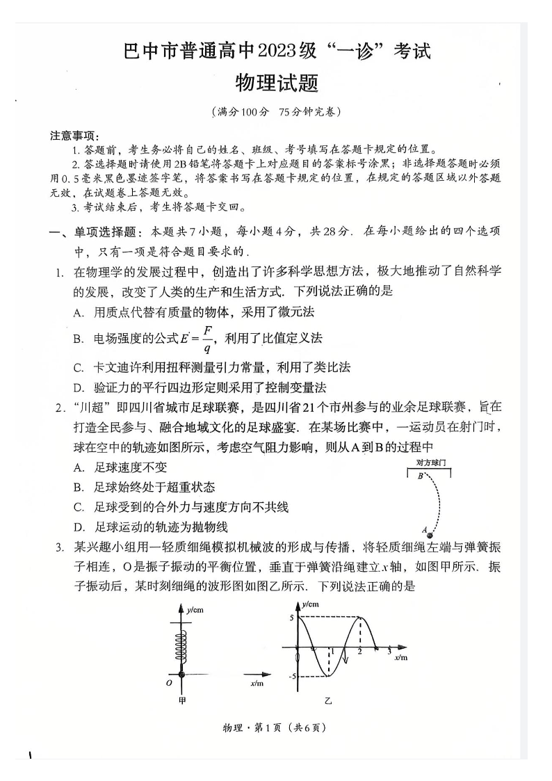 巴中市普通高中2023级“一诊”考试 物理.pdf